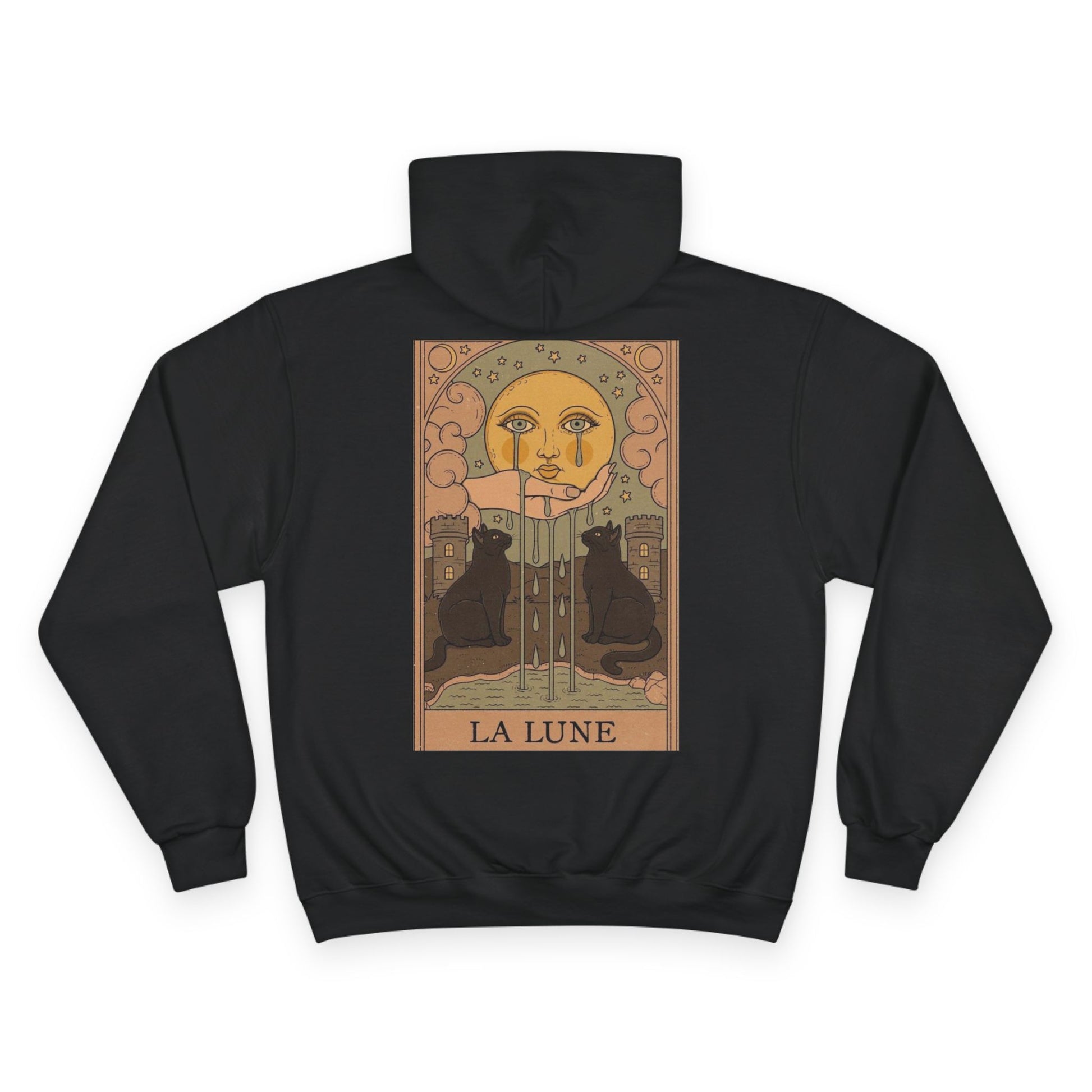 This hoodie honors the La Lune tarot card a symbol of dreams, illusion, and deep subconscious truth. With twin black cats guarding the path and a radiant full moon above, it’s a wearable spell for trusting your intuition and embracing your shadow work.